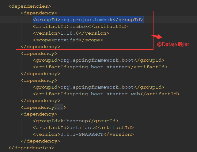 打开pom.xml,找到dependencies标签,在他的下面添加@Data依赖的Jar包 (手敲的),如下图: