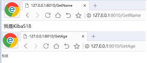 即,函数GetName和GetAge的访问地址为 http://127.0.0.1:8010/GetName和 http://127.0.0.1:8010/GetAge;访问时,我们需要注意,GetName和GetAge这个地址是区分大小写的。。。