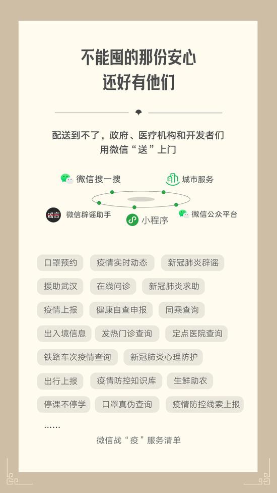 1月24日,国务院办公厅面向社会征集疫情有关线索,微信也迅速在城市服务和“国务院客户端”小程序中接入了国务院“互联网+督查”平台,截至2月10日,国务院疫情督查专区收集群众提交线索20万条。