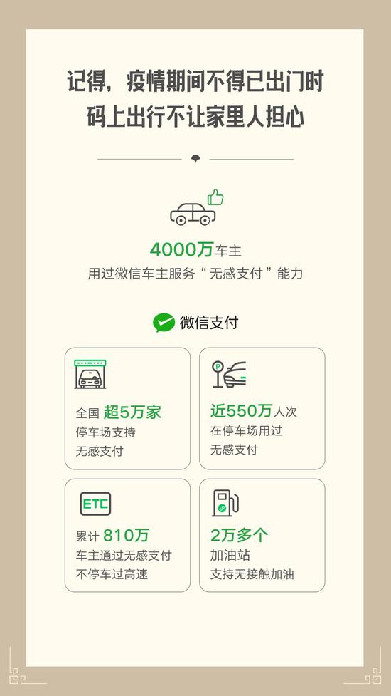 疫情期间,有4000万车主使用过微信车主服务“无感支付”能力,近550万人次在停车场用过无感支付,累计810万车主通过无感支付不停车过高速。目前,全国超5万家停车场支持无感支付,2万多个加油站支持无接触加油。