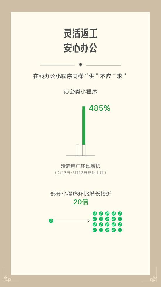 2月3日-13日期间,办公类小程序活跃用户数量环比上月增长485%,部分小程序增长近20倍。
