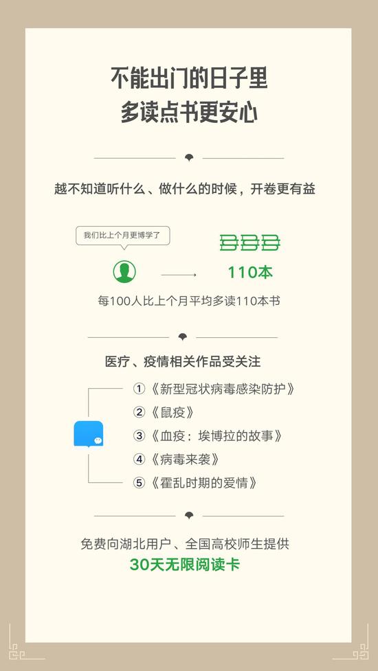 此外,疫情期间,微信读书用户阅读量有所提升,每百人比上个月平均多读110本书。其中医疗、疫情相关作品备受关注,《新型冠状病毒感染防护》成为了大家搜索次数最多的书籍,《鼠疫》、《血疫:埃博拉的故事》等书籍也受到关注。(李楠)