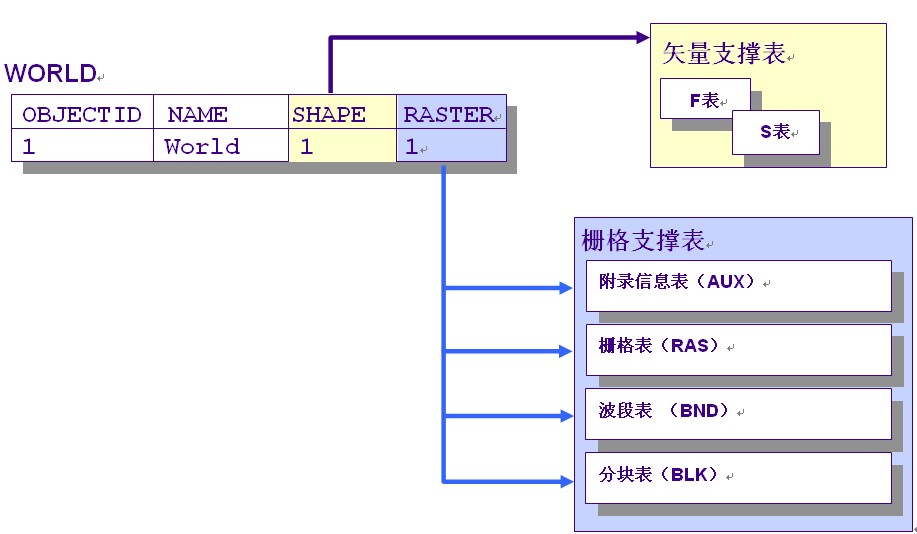 (注:栅格数据的F表和S表都是ArcSDE 9后才引入的,存储F表和S表,用于加快栅格数据的检索,提高访问效率)