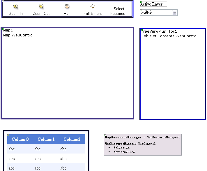 3.新建一个网站,在ArcGIS Web Controls控件中拖动如下控件:Toolbar、Map、Toc、MapResourceManager,以及常用控件Label、DropDownList、Gridview。