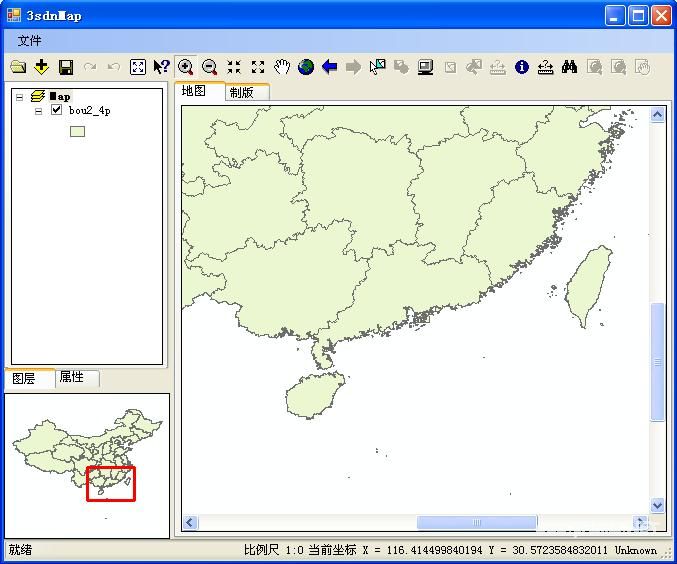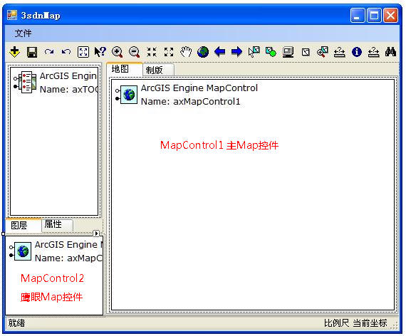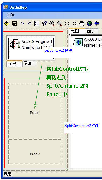 ( 4 )从工具箱中选择 MapControl 控件并拖到 SplitContainer2 的 Panel2 ,作为鹰眼控件。最终效果如图 4 所示。