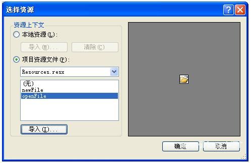 你还可以在属性面板中的 Image 属性中设置你喜欢的菜单图标。单击 Image 那一行右边的按钮,弹出如下菜单。选择“项目资源文件”,再单击导入就可以选择你的图标了。