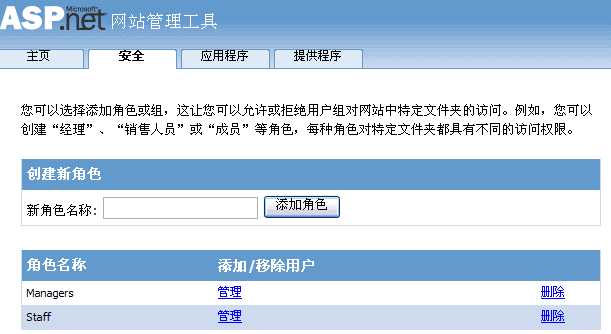 Web Site Administration Tool(WSAT)提供了两种安全设置:Internet和Local network,我们使用Internet方式并创建两个不同的用户组Managers和Staff,并创建了两个用户分别隶属于两个组manager1和staff1,manager相比staff可以多访问一个图层,多使用两个server功能(Indentify查询和一个QueryAttributeTask)。