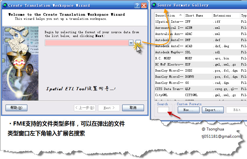 第一种方法是借助ArcGIS自带的扩展,Spatial ETL Tool,该工具是FME的一个模块,通过介绍在ArcGIS环境下逐步地新建一个Spatial ETL Tool,熟悉FME这款软件的风格和主要思想。