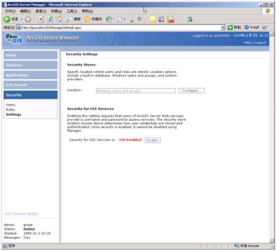 登录到ArcGIS Server Manager,相较于9.2,会发现左侧的目录树多添加了一栏:Security,如图二。展开Security,有三项,分别是UsersRolesSettings。在使用Server Manager所自带的权限管理之前,首先必须切换到Setting,对Location进行设置。Location你可以指定放到SQL ServerWindows本地或者其它自定义的方式(包括其它的数据库和XML等)。自定义的方式在这里就不说了,有兴趣的话,可以参照:http://webhelp.esri.com/arcgisserver/9.3/dotNet/index.htm。我们这里只讨论两种典型的情况:用户和组存放在SQL Server Express以及使用本地用户和组。当然,在我们开始之前,有一些准备工作是需要做的。