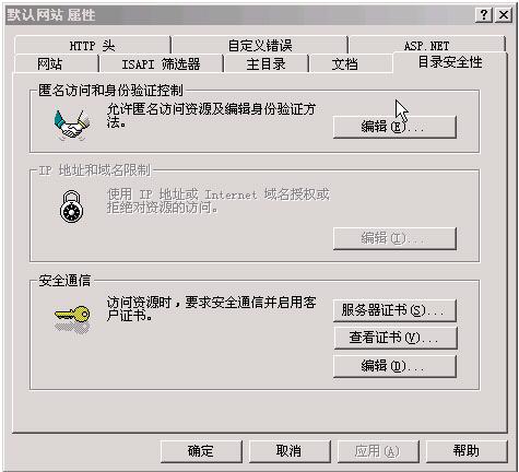 打开IIS,选择默认网站,点击选属性,选择目录安全性,你会发现此时查看证书一栏可以用了。如图三,查看证书一栏可用了,这样就说明SSL证书已经安装好了