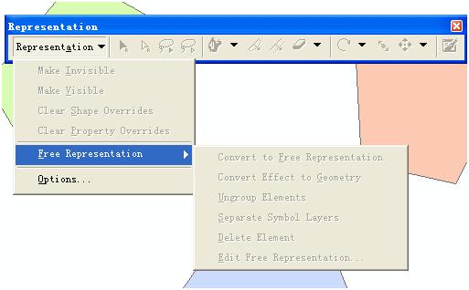 Representation是ArcGIS9.3的新特性,能够通过Representation制作更精美,更复杂的地图操作过程,下图是ArcGIS Desktop中Representation工具条。