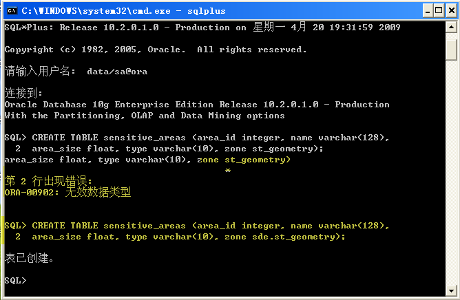 2. 使用SQL语句创建包含ST_Geometry列的表,注意:要使SDE能够认识你创建的要素类,新建的表中有且只能有一个ST_Geometry列,并且最好包含唯一标识的列。