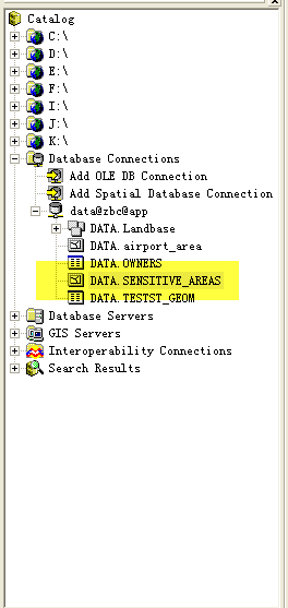 4. 在catalog中查看,可以看到sensitive_areas已经被注册到sde中,并且图标显示为polygon类型。