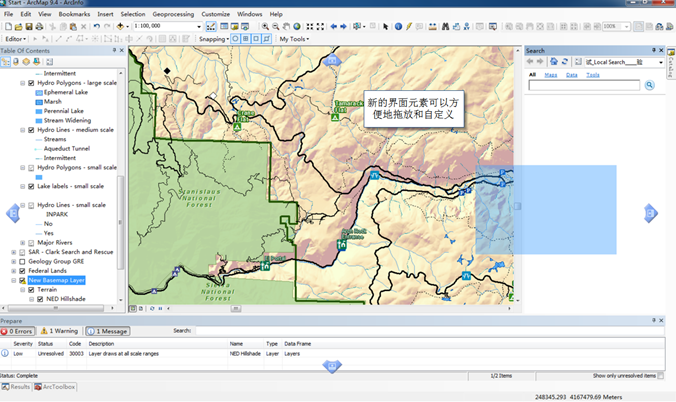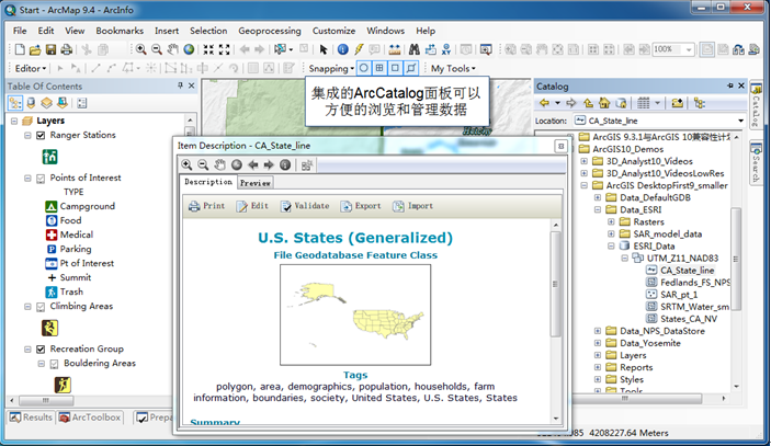 制作地图时要加入图层的数据源在ArcSDE数据库中,需要转到ArcCatalog中才能连接……这一切,在ArcGIS Desktop 10中将不复存在:以往负责数据管理的ArcCatalog作为一个面板被整合入ArcMap、ArcGlobe、ArcScene当中,我们可以在单一界面下完成我们的工作了。而且在面板ArcCatalog中一样可以轻松的预览数据。另一方面ArcCatalog独立程序本身也被保留,以往的操作习惯也不会强迫用户改变。
