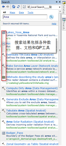 在信息爆炸的今天,搜索几乎成为我们生活的一部分,在ArcGIS Desktop 10中我们同样把搜索融入了我们的工作。在新增的搜索面板中我们可以方便地搜索文档、数据乃至GP工具。这种搜索支持通配符。和大多数硬盘搜索软件一样ArcGIS Desktop 10中的搜索是预先建立索引的,结果即搜即现。用户也能自由地管理索引数据——包括定制建立搜索索引的范围和频率。