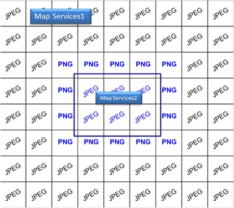 (3)、新增的“Mixed”模式缓存 在ArcGIS 10的切片格式选项中,提供了新的“Mixed”的格式选择。该选择适合采用JPEG格式的切图服务的叠加应用。如下图所示,一般来说,对于背景底图的切片,为节省磁盘空间和访问速度,可采用JPEG的切片格式,但是当两个JPEG格式服务进行叠加时候,会存在“项圈”现象,这是因为在进行切片时候,为保证服务的正确叠加,切片会采用“超级切片方式”,即在地图范围之外,切4096x4096的范围,由于JPEG不支持透明色,因此造成叠加部分周围的空白,如下图所示:
