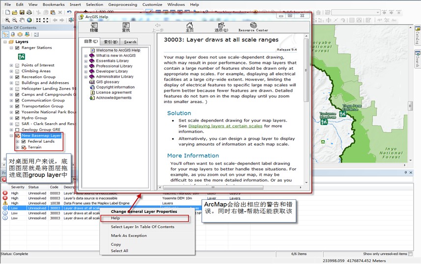 摘要:ArcGIS 10研究(四)Desktop之地图浏览,这次的介绍内容主要是一些ArcMap在地图浏览方面新增的功能点。 这次的介绍内容主要是一些ArcMap在地图浏览方面新增的功能点。 1. BASEMAP——底图图层 底图图层功能是ArcGIS 10中比较重要的一个新功能,也一直是ESRI隆重推荐的亮 点之一。在此之前,地图底图一直是一个逻辑上的概念。我们的每一个地图文档似乎都会有一个或一些图层被称为“地图底图”。而在ArcGIS 10中,“地图底图”这一概念被“实例化”了:在用户浏览,变换可视范围过程中,它被快速、精细的渲染;底图上的要素不会也不能去修改,但能够查询和捕捉;底图图层和一般图层的转换十分方便,拖过来就行。为了方便用户的使用,ArcMap还引入了类似一些程序集成开发环境的“编译-警告-报错”功能:如果您加入底图图层的数据不满足要求,或者还有改进的空间,ArcMap就会给出相应的警告或者错误——不知道信息说的是啥?直接选中该信息,再右键帮助就明白啦。 从原理上说,底图图层其实就是缓存图层,但是它的用户交互完全不同,方便桌面用户能够“爽快”的使用。另外,ArcMap还为地图数据的浏览提供了硬件加速功能哦,用户甚至可以精细的设置是否在远程桌面的情况下显示…… 2. Quick paint Quick paint也是一个比较有意思的功能,它的操作很简单,就是按住“Q”键移动鼠标,作用和第一人称射击游戏中利用鼠标控制视角类似,地图的可见范围会随着鼠标的移动向相应方向改变。当然,前提是建立了地图底图,不然频繁刷新会让地图“闪”得很厉害。不过,这个功能有什么用呢……看视频吧,该用户在进行地图数字化工作~