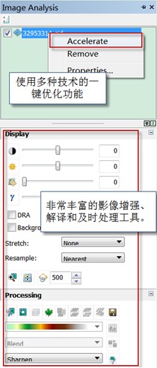 3. 比例尺锁定 这个功能就很简单啦,就是把ArcMap浏览地图的比例尺固定在指定的几个上。如果我们的地图需要发布为网络服务,而又需要锁定比例尺的话,只需在比例尺设置选项卡中选中该功能,就可以方便地在桌面程序中模拟实战效果啦。 4. Time Time是ArcGIS 10为我们提供的一个为GIS加入时间维度的快捷办法。只需非常简单的对地理要素添加时间字段描述其发生的起始和终止时间就可以在ArcMap中“播放”地理现象啦,比如我们可以如图所示地展示1986年至2008年某区域内的火灾发生情况。使用类似视频播放器的进度条可以随意回放各个年份(或者月份等其它时间跨度)发生火灾的区域,而我们所要做的仅仅是为每一个火灾发生区域记录上添加时间属性字段。 5. 栅格数据浏览 在ArcGIS 10中,底层的栅格数据访问库采用了新的GDAL库,据实际测试影像数据的读取速度有了10%~40%的提高,同时支持了更多的数据格式,包括BigTIF,TIF with 12bit JPEG等。UI方面,ArcMap专门增加了影像分析窗口,里面包括对比度、亮度、透明度、卷帘效果、采样设置、正色校正、全色锐化、剪裁、镶嵌和NDVI等等,常用的分析功能一应俱全,都能快速访问。我们还可以直接在影像分析窗口中右键单击需要操作的图层实现“一键优化”。这种优化同时使用了缓存、多线程和硬件加速技术,对用户来说实在是太方便啦。 6. 地图包 我们大都有过这样的经历,有个地图文档要拷给同学/同事:要拷mxd文档又要带着数据,还要顾及数据的存放位置,甚至如果数据存放在GeoDatabase中我们还要先把它抽取出来再改动mxd文档中的数据源……总之,十分繁琐。而地图包顾名思义就是将地图文档打包的工具,它的作用就是代替我们完成上面的一堆工作。我们需要做的仅仅是和使用压缩工具一样在本地将地图文档“压缩”,拷到目的地再“解压缩”就可以直接使用啦——当然,对方用的也得是ArcGIS 10才行。