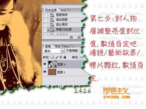 第七步:对人物层调整亮度对比度,数值自定吧,滤镜——艺术效果——胶片颗粒,数值自定。