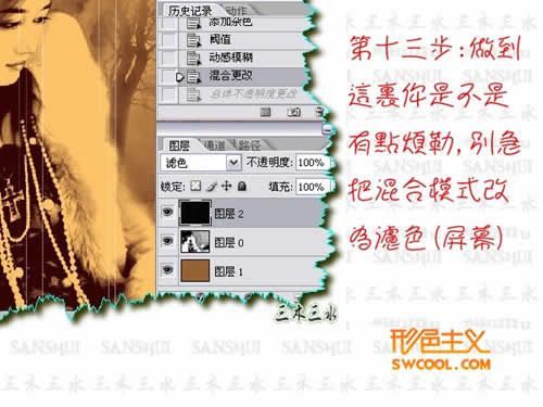 第十三步:做到这里你是不是有点烦了,别急把混合模式改为滤色(屏幕)