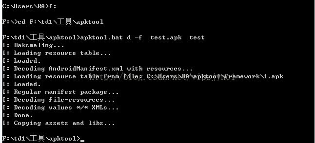 (命令中test.apk指的是要反编译的APK文件全名,test为反编译后资源文件存放的目录名称,即为:apktool.bat d -f [apk文件 ] [输出文件夹])