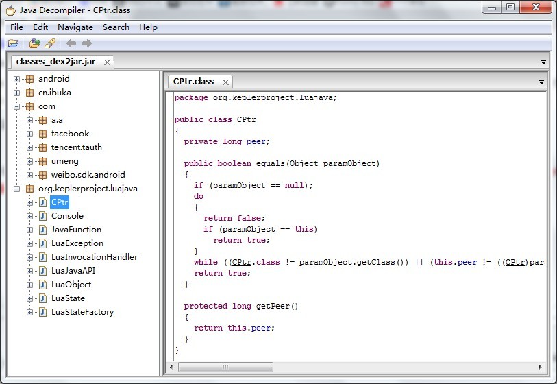在改目录下会生成一个classes_dex2jar.jar的文件,然后打开工具jd-gui文件夹里的jd-gui.exe,之后用该工具打开之前生成的classes_dex2jar.jar文件,便可以看到源码了,效果如下: