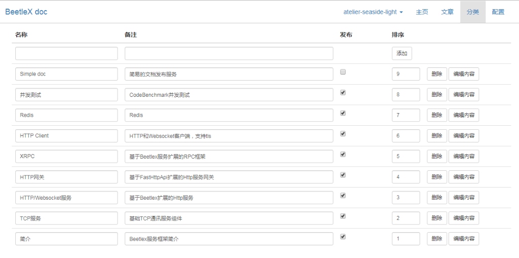 不过分类还是文章都有内容,如果分类有内容的情况在浏览时会把内容展现出来,如果没有则会拿分类下的第一篇文章来展现。除了基础信息外还提供是否发布和排序的顺序设置,如果没有发布的分类或文章是不会被展现出来。