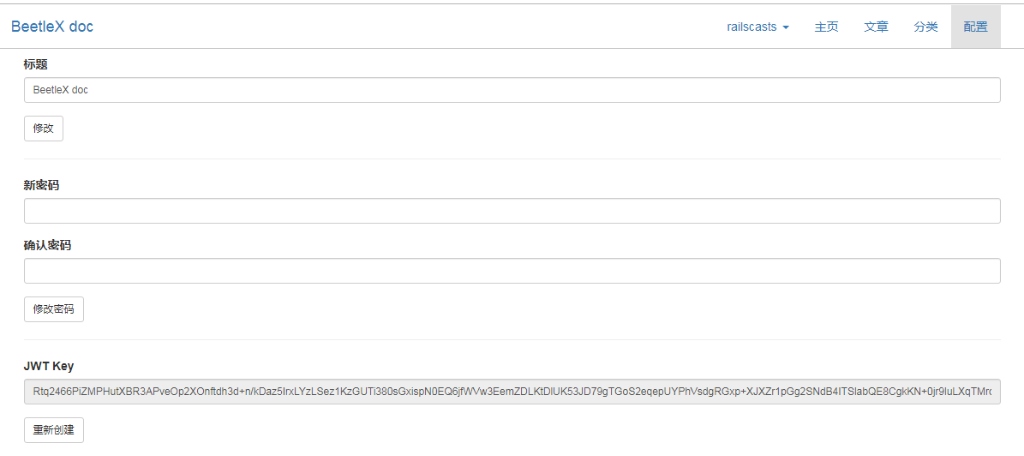 既然是简易版,那在功能管理当然也是直接粗暴,功能和界面都相当简陋!功能主要有三个:分类管理,文章管理和配置(注意:登陆的用户名是 admin