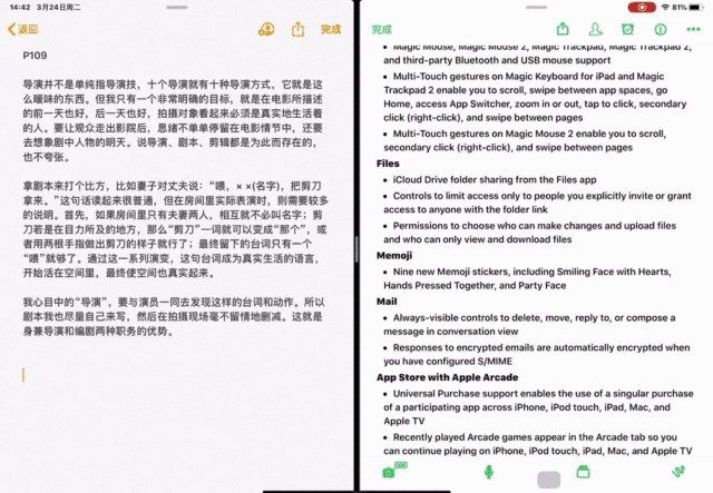 其次,iPadOS 13.4 还支持妙控鼠标、妙控板、带触控板键盘配件的手势操作,诸如双指轻扫滚动、三指向上轻扫停住激活后台、双指开合缩放、三指轻扫切换 app 等手势也将极大地提高 iPad 的非触控操作体验。