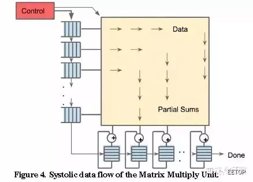 TPU1,大约700M Hz,有256X256尺寸的脉动阵列,如下图所示。一共256X256=64K个乘加单元,每个单元一次可执行一个乘法和一个加法。那就是128K个操作。(乘法算一个,加法再算一个)