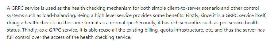 public class HealthCheckService:Health.HealthBase { public override Task<HealthCheckResponse> Check(HealthCheckRequest request, ServerCallContext context) { //TODO:检查逻辑 return Task.FromResult(new HealthCheckResponse(){Status = HealthCheckResponse.Types.ServingStatus.Serving}); } public override async Task Watch(HealthCheckRequest request, IServerStreamWriter<HealthCheckResponse> responseStream, ServerCallContext context) { //TODO:检查逻辑 await responseStream.WriteAsync(new HealthCheckResponse() {Status = HealthCheckResponse.Types.ServingStatus.Serving}); } }