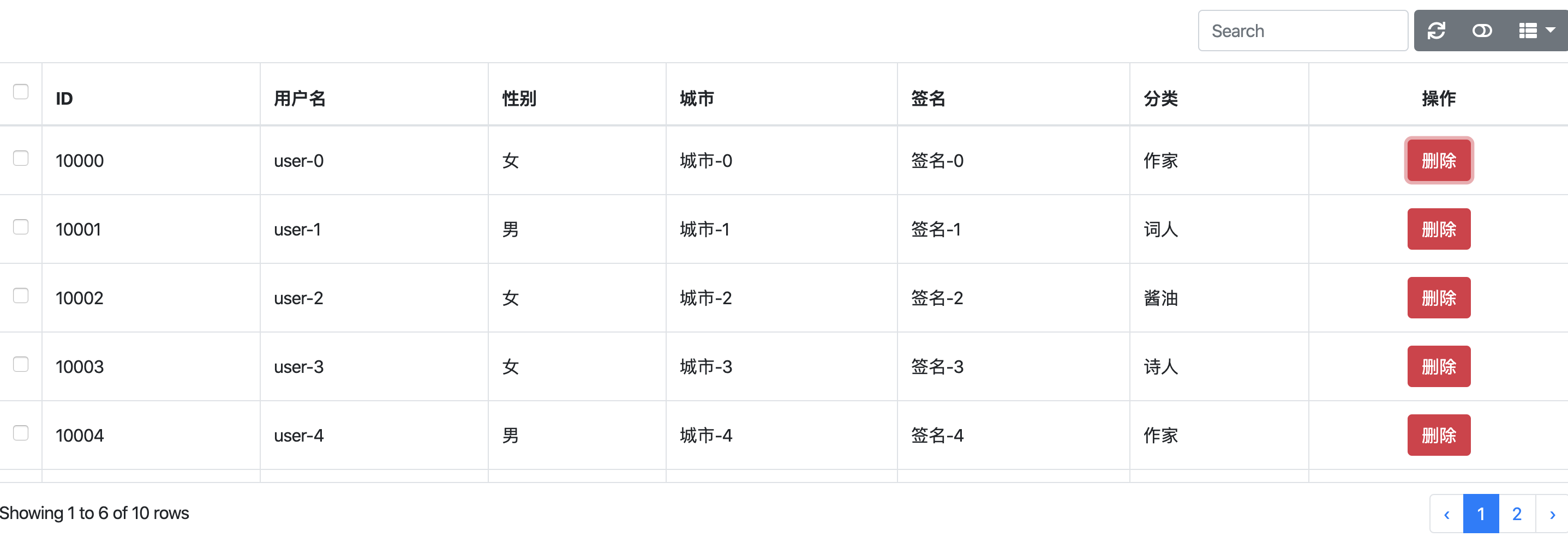<!DOCTYPE html> <html lang="en"> <head> <meta charset="UTF-8"> <title>Hello, Bootstrap Table!</title> // 引入 css <link rel="stylesheet" href="https://stackpath.bootstrapcdn.com/bootstrap/4.2.1/css/bootstrap.min.css" integrity="sha384-GJzZqFGwb1QTTN6wy59ffF1BuGJpLSa9DkKMp0DgiMDm4iYMj70gZWKYbI706tWS" crossorigin="anonymous"> <link rel="stylesheet" href="https://use.fontawesome.com/releases/v5.6.3/css/all.css" integrity="sha384-UHRtZLI+pbxtHCWp1t77Bi1L4ZtiqrqD80Kn4Z8NTSRyMA2Fd33n5dQ8lWUE00s/" crossorigin="anonymous"> <link rel="stylesheet" href="https://unpkg.com/bootstrap-table@1.15.3/dist/bootstrap-table.min.css"> </head> <body> // 需要填充的表格 <table id="tb_departments" data-filter-control="true" data-show-columns="true"></table> // 引入js <script src="https://code.jquery.com/jquery-3.3.1.min.js" integrity="sha256-FgpCb/KJQlLNfOu91ta32o/NMZxltwRo8QtmkMRdAu8=" crossorigin="anonymous"></script> <script src="https://cdnjs.cloudflare.com/ajax/libs/popper.js/1.14.6/umd/popper.min.js" integrity="sha384-wHAiFfRlMFy6i5SRaxvfOCifBUQy1xHdJ/yoi7FRNXMRBu5WHdZYu1hA6ZOblgut" crossorigin="anonymous"></script> <script src="https://stackpath.bootstrapcdn.com/bootstrap/4.2.1/js/bootstrap.min.js" integrity="sha384-B0UglyR+jN6CkvvICOB2joaf5I4l3gm9GU6Hc1og6Ls7i6U/mkkaduKaBhlAXv9k" crossorigin="anonymous"></script> <script src="https://unpkg.com/bootstrap-table@1.15.3/dist/bootstrap-table.min.js"></script> <script> window.operateEvents = { // 当点击 class=delete 时触发 'click .delete': function (e,value,row,index) { // 在 console 打印出整行数据 console.log(row); } }; $('#tb_departments').bootstrapTable({ url: '/frontend/bootstrap-table/user.json', //请求后台的 URL(*) method: 'get', //请求方式(*) // data: data, //当不使用上面的后台请求时,使用data来接收数据 toolbar: '#toolbar', //工具按钮用哪个容器 striped: true, //是否显示行间隔色 cache: false, //是否使用缓存,默认为 true,所以一般情况下需要设置一下这个属性(*) pagination: true, //是否显示分页(*) sortable: false, //是否启用排序 sortOrder: "asc", //排序方式 sidePagination: "client", //分页方式:client 客户端分页,server 服务端分页(*) pageNumber:1, //初始化加载第一页,默认第一页 pageSize: 6, //每页的记录行数(*) pageList: [10, 25, 50, 100], //可供选择的每页的行数(*) search: true, //是否显示表格搜索,此搜索是客户端搜索,不会进服务端,所以个人感觉意义不大 strictSearch: true, //启用严格搜索。禁用比较检查。 showColumns: true, //是否显示所有的列 showRefresh: true, //是否显示刷新按钮 minimumCountColumns: 2, //最少允许的列数 clickToSelect: true, //是否启用点击选中行 height: 500, //行高,如果没有设置 height 属性,表格自动根据记录条数觉得表格高度 uniqueId: "ID", //每一行的唯一标识,一般为主键列 showToggle:true, //是否显示详细视图和列表视图的切换按钮 cardView: false, //是否显示详细视图 detailView: false, //是否显示父子表 showExport: true, //是否显示导出 exportDataType: "basic", //basic', 'all', 'selected'. columns: [{ checkbox: true //复选框标题,就是我们看到可以通过复选框选择整行。 }, { field: 'id', title: 'ID' //我们取json中id的值,并将表头title设置为ID }, { field: 'username', title: '用户名' //我们取 json 中 username 的值,并将表头 title 设置为用户名 },{ field: 'sex', title: '性别' //我们取 json 中 sex 的值,并将表头 title 设置为性别 },{ field: 'city', title: '城市' //我们取 json 中 city 的值,并将表头 title 设置为城市 },{ field: 'sign', title: '签名' //我们取 json 中 sign 的值,并将表头 title 设置为签名 },{ field: 'classify', title: '分类' //我们取 json 中 classify 的值,并将表头 title 设置为分类 },{ //ormatter:function(value,row,index) 对后台传入数据 进行操作 对数据重新赋值 返回 return 到前台 // events 触发事件 field: 'Button',title:"操作",align: 'center',events:operateEvents,formatter:function(value,row,index){ var del = '<button type="button" class="btn btn-danger delete">删除</button>' return del; } } ], responseHandler: function (res) { return res.data //在加载远程数据之前,处理响应数据格式. // 我们取的值在data字段中,所以需要先进行处理,这样才能获取我们想要的结果 } }); </script> </body> </html>