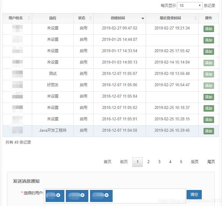 注意:这里统一从表格添加用户,然后添加按钮不可点击;统一从标签框移除用户,移除后刷新表格当前页,已移除的用户操作栏的添加按钮变为可点击。
