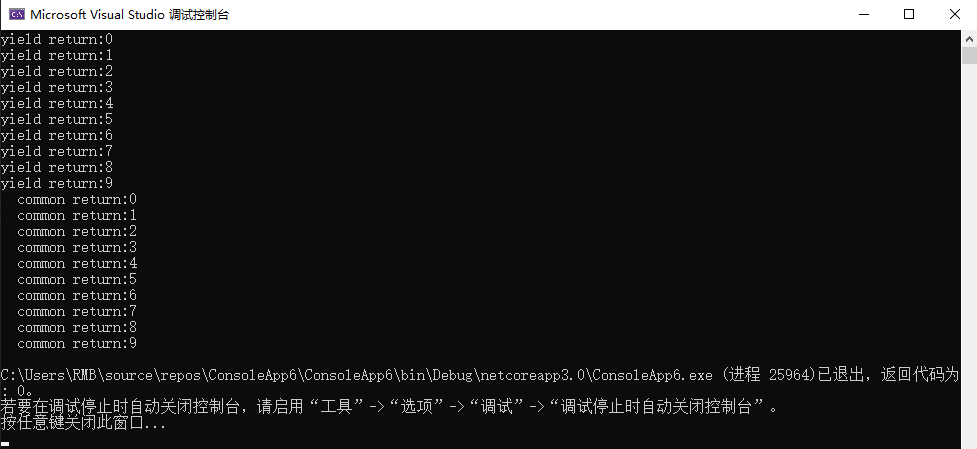 通过代码的运行结果,我们可以看到这里返回的结果 yield return 和comment return是分成两边的。先执行完一个然后开始执行另外一个。不干涉。
