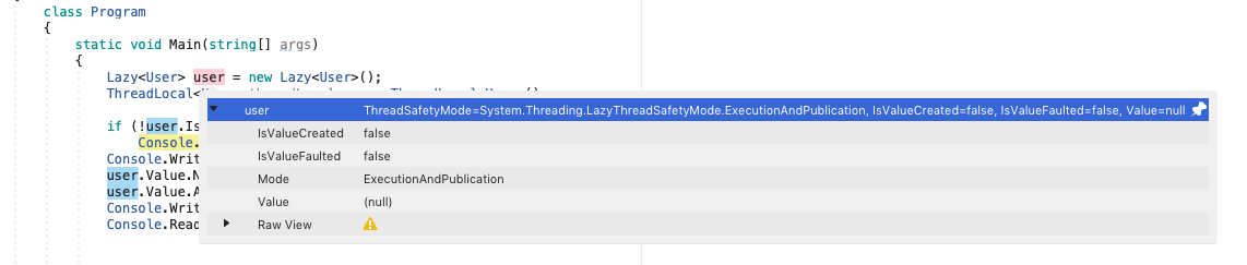 class Program { static void Main(string[] args) { Lazy<User> user = new Lazy<User>(); ThreadLocal<User> threadLocal = new ThreadLocal<User>(); if (!user.IsValueCreated) Console.WriteLine("The object is not initialized"); Console.WriteLine(user.Value.Name); user.Value.Name = "Name1"; user.Value.Age = 1; Console.WriteLine(user.Value.Name); Console.Read(); } }