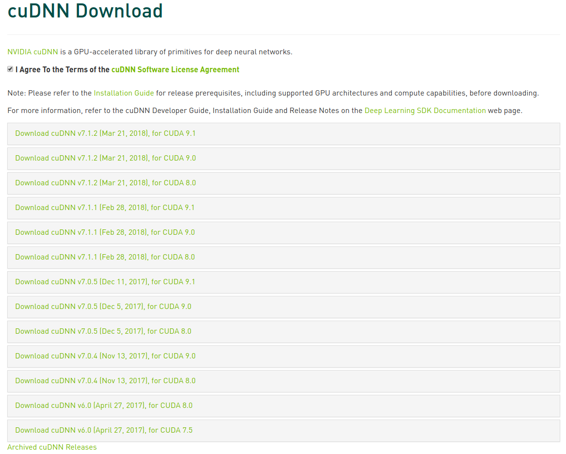 cuDNN 的全称是 The NVIDIA CUDA® Deep Neural Network library,是专门用来对深度学习加速的库,它支持 Caffe2, MATLAB, Microsoft Cognitive Toolkit, TensorFlow, Theano 及 PyTorch 等深度学习的加速优化,目前最新版本是 cuDNN 7.1,接下来我们来看下它的安装方式。