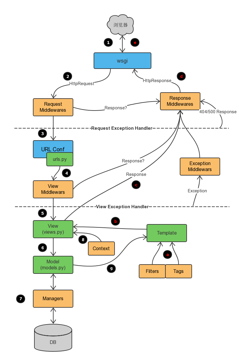 请求到达中间件之后,先按照正序执行每个注册中间件的process_request方法,process_request方法返回的值是None,就依次执行,如果返回的值是HttpResponse对象,不再执行后面的process_request方法,而是执行当前对应中间件的process_response方法(注意不是掉头执行所有的process_response方法),将HttpResponse对象返回给浏览器。也就是说:如果MIDDLEWARE中注册了6个中间件,执行过程中,第3个中间件返回了一个HttpResponse对象,那么第4,5,6中间件的process_request和process_response方法都不执行,顺序执行3,2,1中间件的process_response方法。