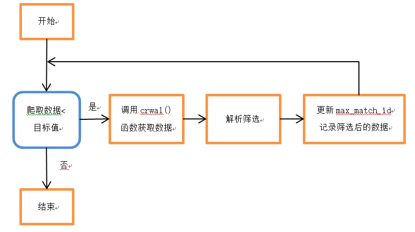 外层while循环判断已经获取的比赛数据数量是否达到目标值,未达到则继续循环;在每次while循环中,首先通过crawl()函数获取服务器返回的数据,内层for循环对每一条json数据进行解析、筛选(其中lobby_type=7是天梯匹配,game_mode=3是随机征召模式,game_mode=22是天梯全英雄选择模式)。在for循环结束后,更新max_match_id的值(使其对应到当前爬取数据的最后一条数据,下一次爬取数据时则从该位置继续向下爬取),再将新爬取的数据写入csv数据文件。工作流程如下方图示,其中蓝框表示条件判断。