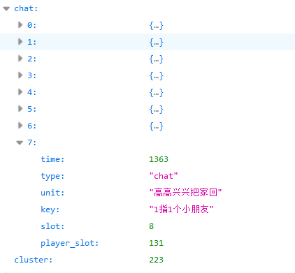 上面就是一条聊天记录示例,在这局游戏的第7条聊天记录中,玩家“高高兴兴把家回”发送了消息:”1指1个小朋友”。
