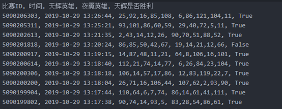 最终,我们通过该爬虫爬取了10万条游戏对阵数据,其格式如下: