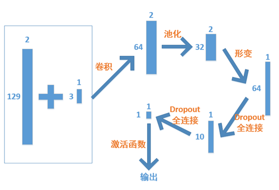 模型构建的示意图如下,使用维度为长度为3的一维卷积核对输入进行卷积操作,之后再经过池化和两次全链接操作,将维度变为[1*1],最后使用sigmoid激活函数将输出限定在[0,1]之间,即对应样本的获胜概率。下图展现了矩阵、向量的维度变化情况。
