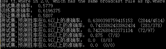 我们将训练后的模型来对测试集进行预测,经过这一天的反复调参,得到了多个预测效果不错的模型,最高的模型预测准确度可以达到58%。即,对于“看阵容猜胜负”这个任务,模型可以达到58%的准确率。为了更全面的了解模型的预测效果,我们分别计算模型在测试集、训练集、验证集上的预测准确度,并计算模型在打分较高的情况下的预测精度。以下面这个模型为例: