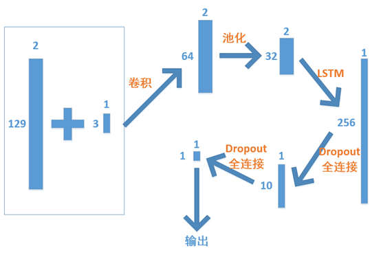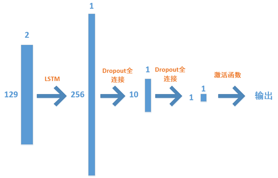 模型构建的示意图如下,LSTM层直接以[2,129]的样本矩阵作为输入,生成一个长度为256的特征向量,该特征向量经过两次Dropout和全连接,成为一个标量,再使用sigmoid激活函数将输出限定在[0,1]之间。