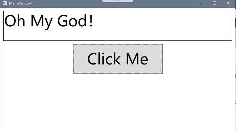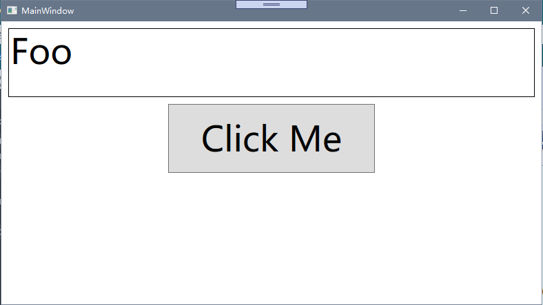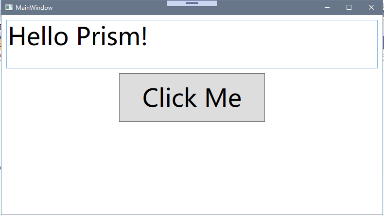 <Window x:Class="PrismSample.Views.MainWindow"xmlns="http://schemas.microsoft.com/winfx/2006/xaml/presentation"xmlns:x="http://schemas.microsoft.com/winfx/2006/xaml"xmlns:d="http://schemas.microsoft.com/expression/blend/2008"xmlns:mc="http://schemas.openxmlformats.org/markup-compatibility/2006"xmlns:prism="http://prismlibrary.com/"xmlns:local="clr-namespace:PrismSample"mc:Ignorable="d"Title="MainWindow" Height="450" Width="800" prism:ViewModelLocator.AutoWireViewModel="True"> <StackPanel> <TextBox Text="{Binding Text}" Margin="10" Height="100" FontSize="50" Foreground="Black" BorderBrush="Black"/> <Button Height="100" Width="300" Content="Click Me" FontSize="50" Command="{Binding ClickCommnd}"/> </StackPanel> </Window>