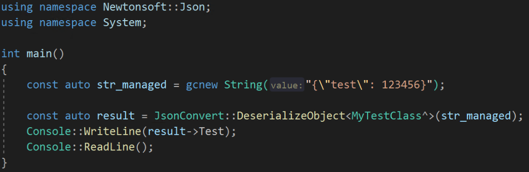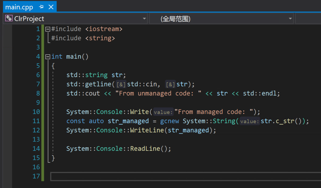 托管堆对象指针的类型为 T^,而不是 T*,以上述代码为例,str_managed 的类型为 System::String^。得益于 C++ 11 开始有的类型自动推导,我们可以直接使用 auto 代替显示类型声明,类似 C# 中的 var。