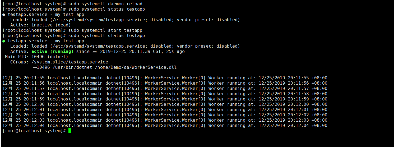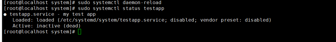 重新运行 sudo systemctl status testapp 查看服务状态显示已激活正在运行中