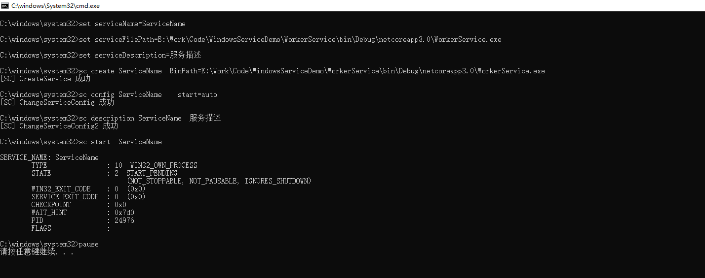 set serviceName=ServiceName set serviceFilePath=E:WorkCodeWindowsServiceDemoWorkerServicebinDebugnetcoreapp3.0WorkerService.exe set serviceDescription=服务描述 sc create %serviceName% BinPath=%serviceFilePath%sc config %serviceName% start=auto sc description %serviceName% %serviceDescription%sc start %serviceName%pause
