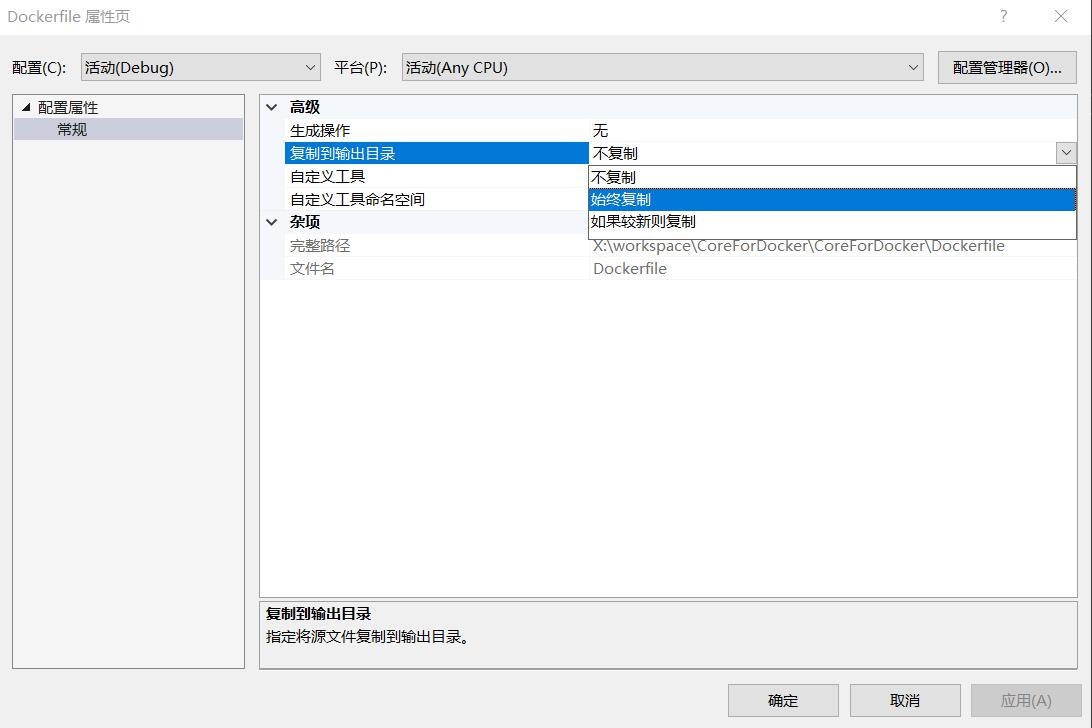 ENTRYPOINT ["dotnet", "/out/CoreForDocker.dll"]:容器启动的时候执行dotnet命令,参数为/out/CoreForDocker.dll