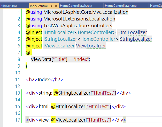 @inject IViewLocalizer viewLocalizer viewLocalizer["About"] @Html.ActionLink((string)viewLocalizer["About"], "About", "Home") @Html.ActionLink(viewLocalizer["About"].Value, "About", "Home")