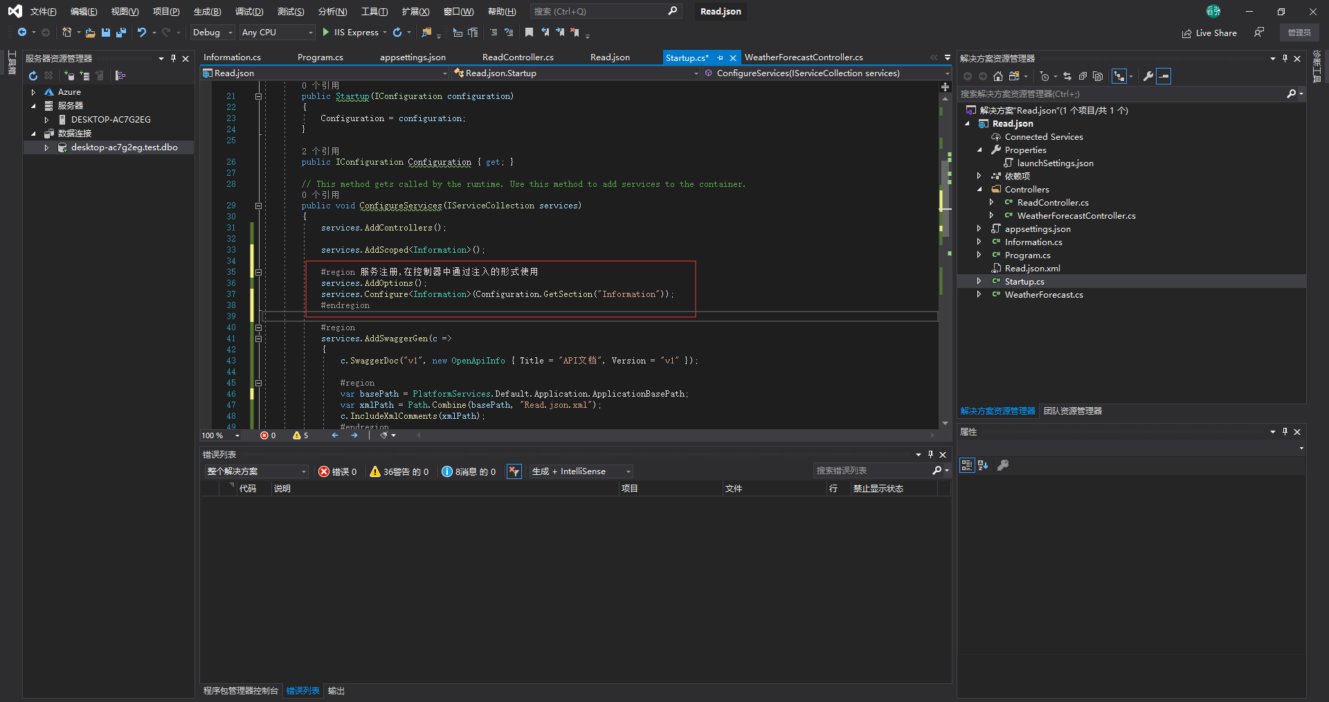 #region 服务注册,在控制器中通过注入的形式使用services.AddOptions(); services.Configure<Information>(Configuration.GetSection("Information"));#endregion